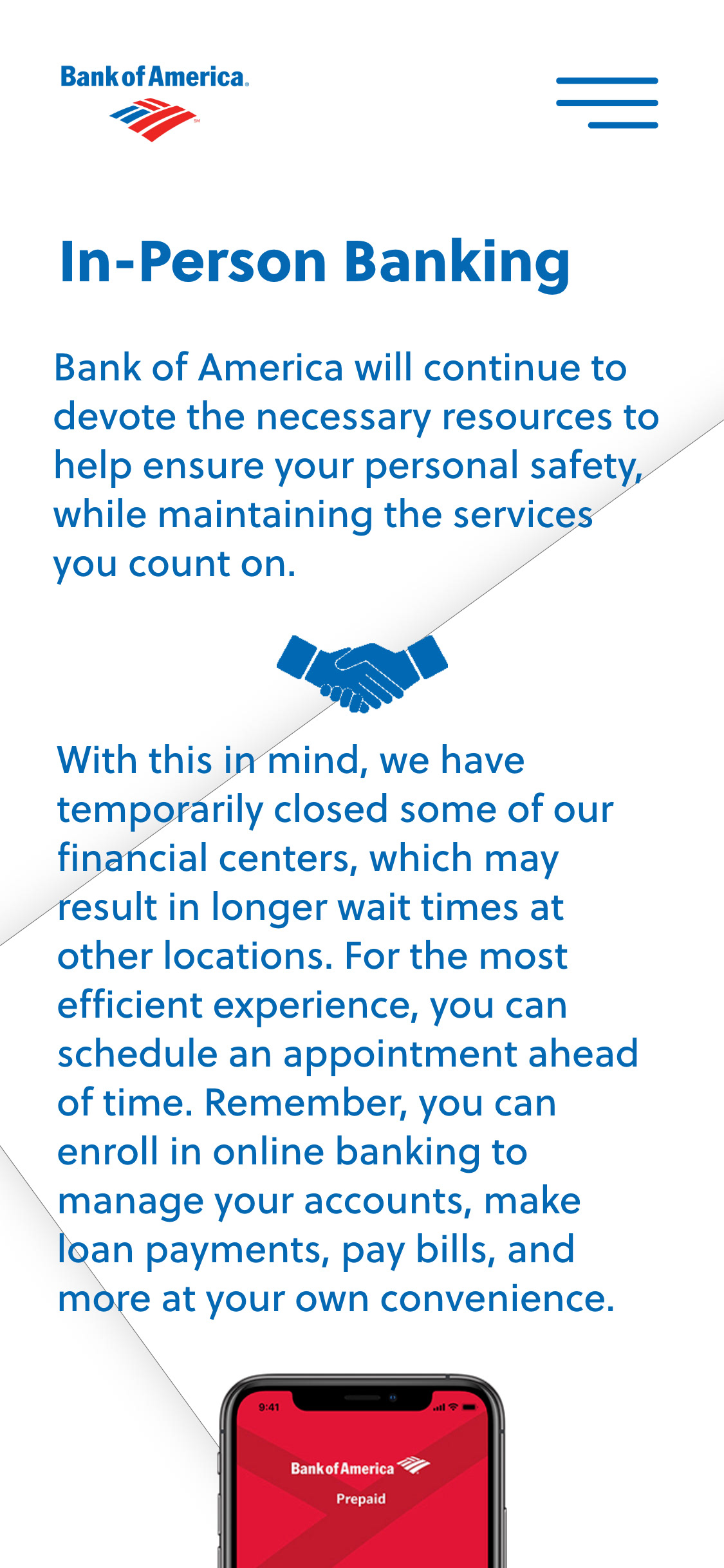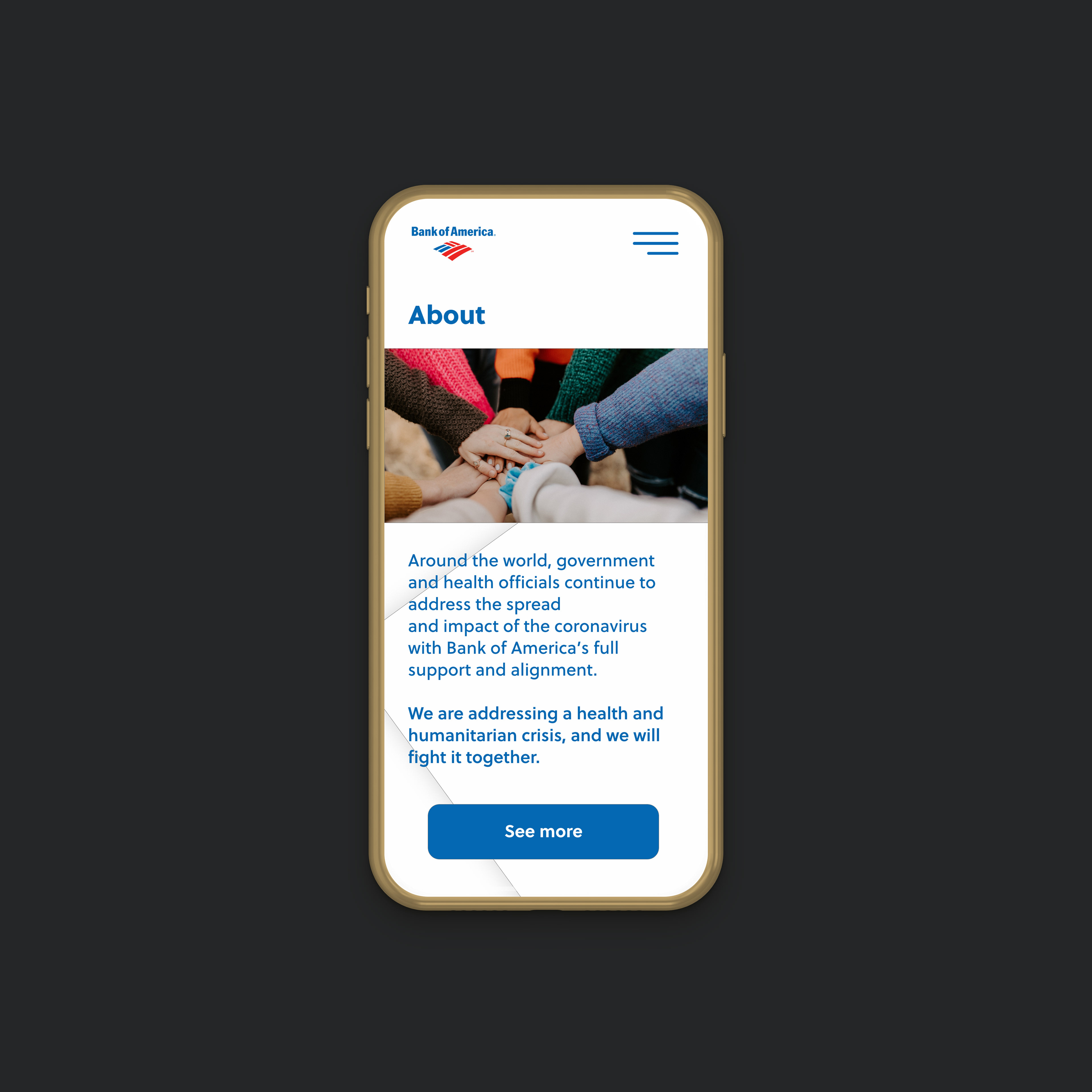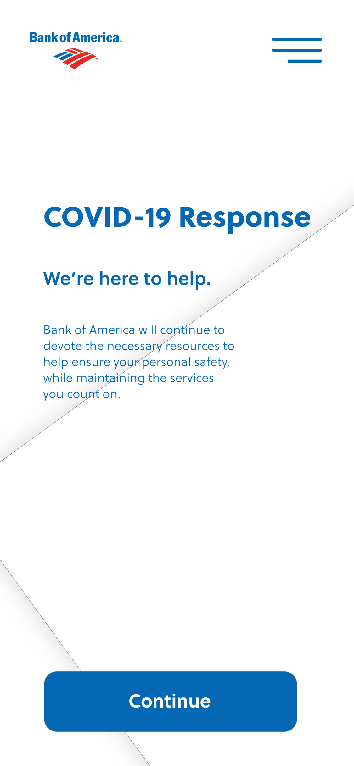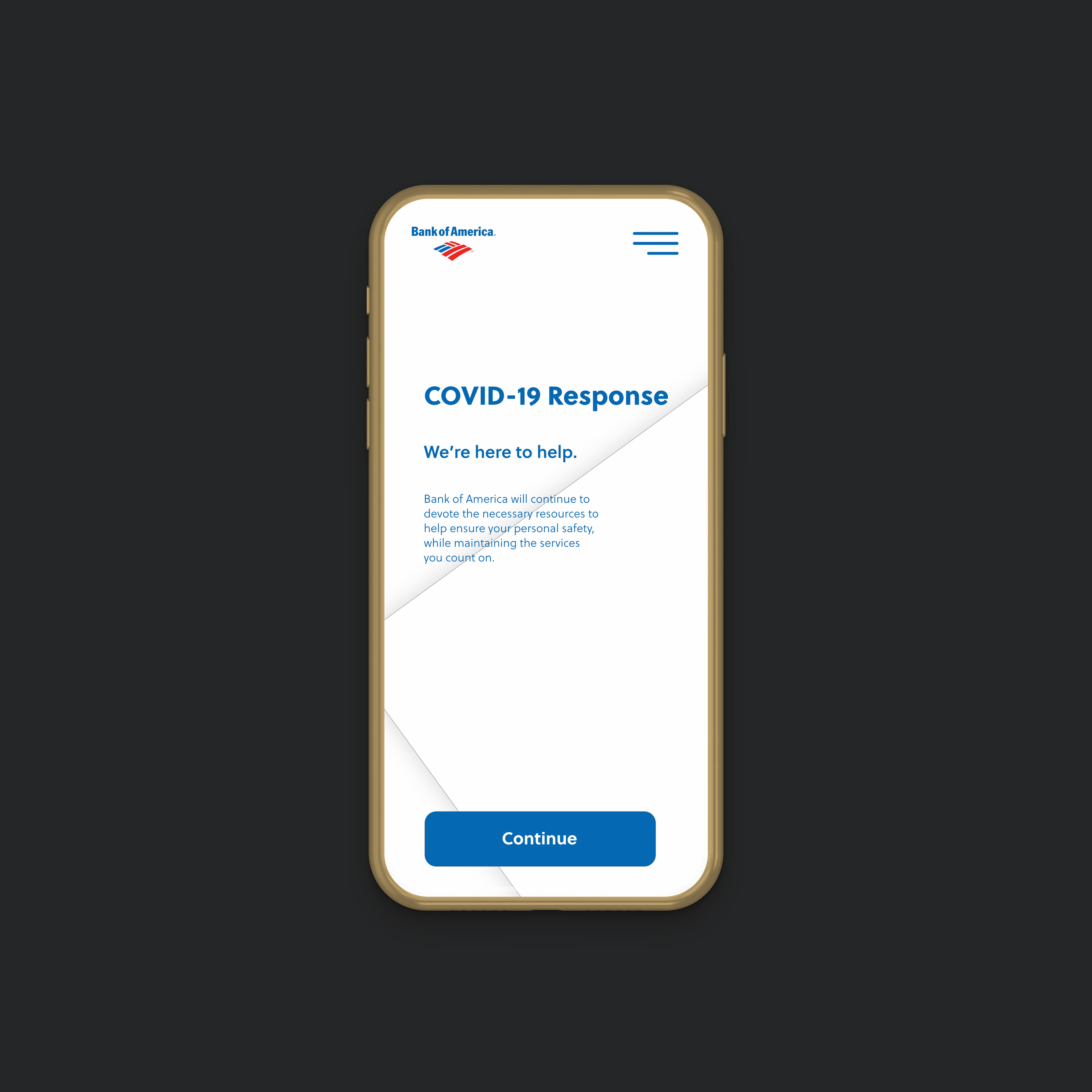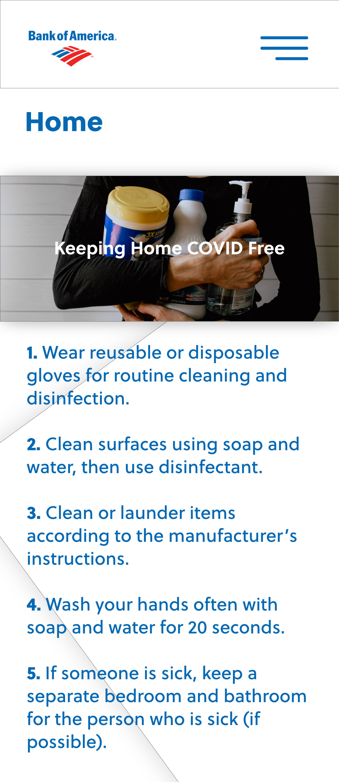 Task: Identify four of Bank of America's COVID-19 efforts and using copy/text from this company, develop an app to inform users about what your company is doing to keep them safe during this time.
