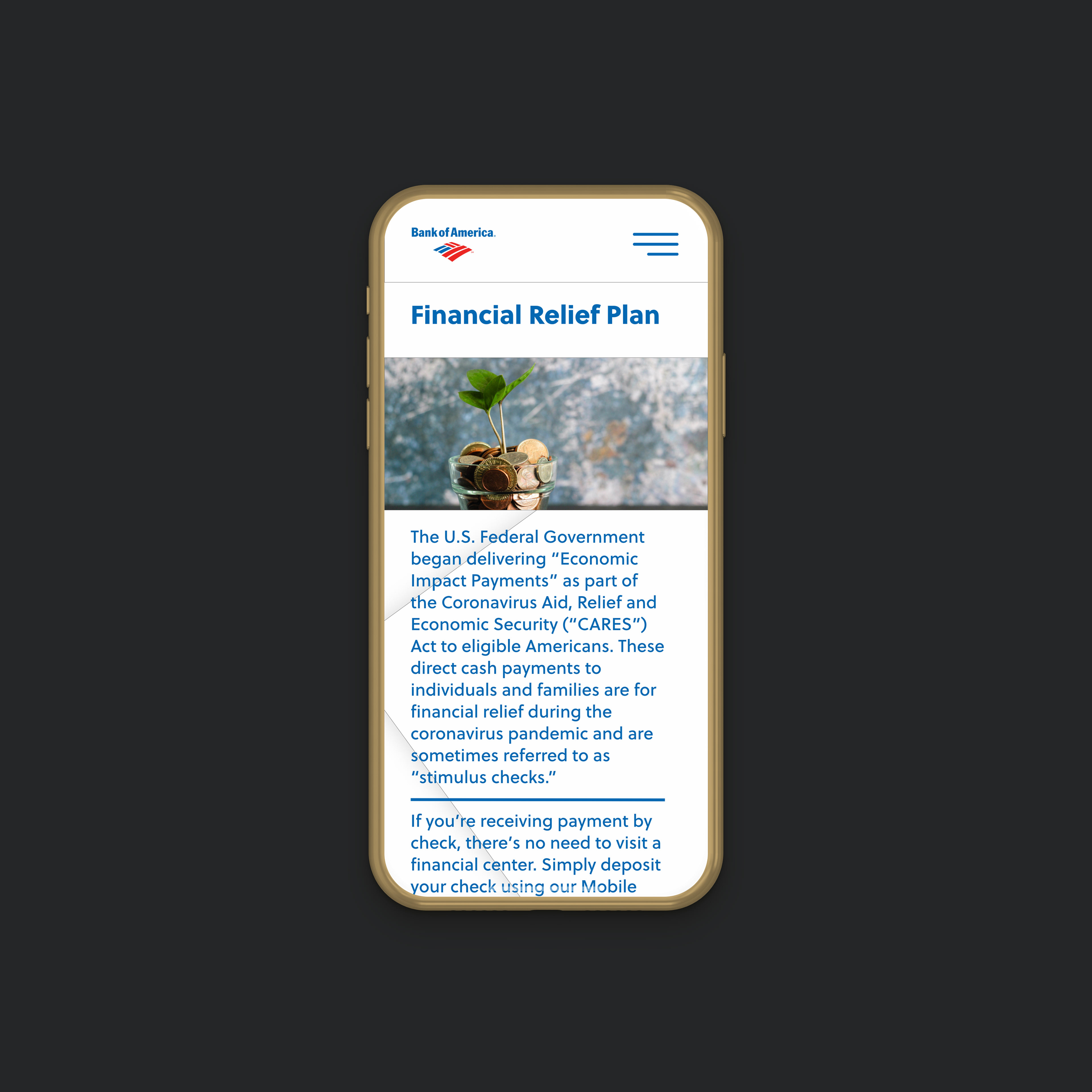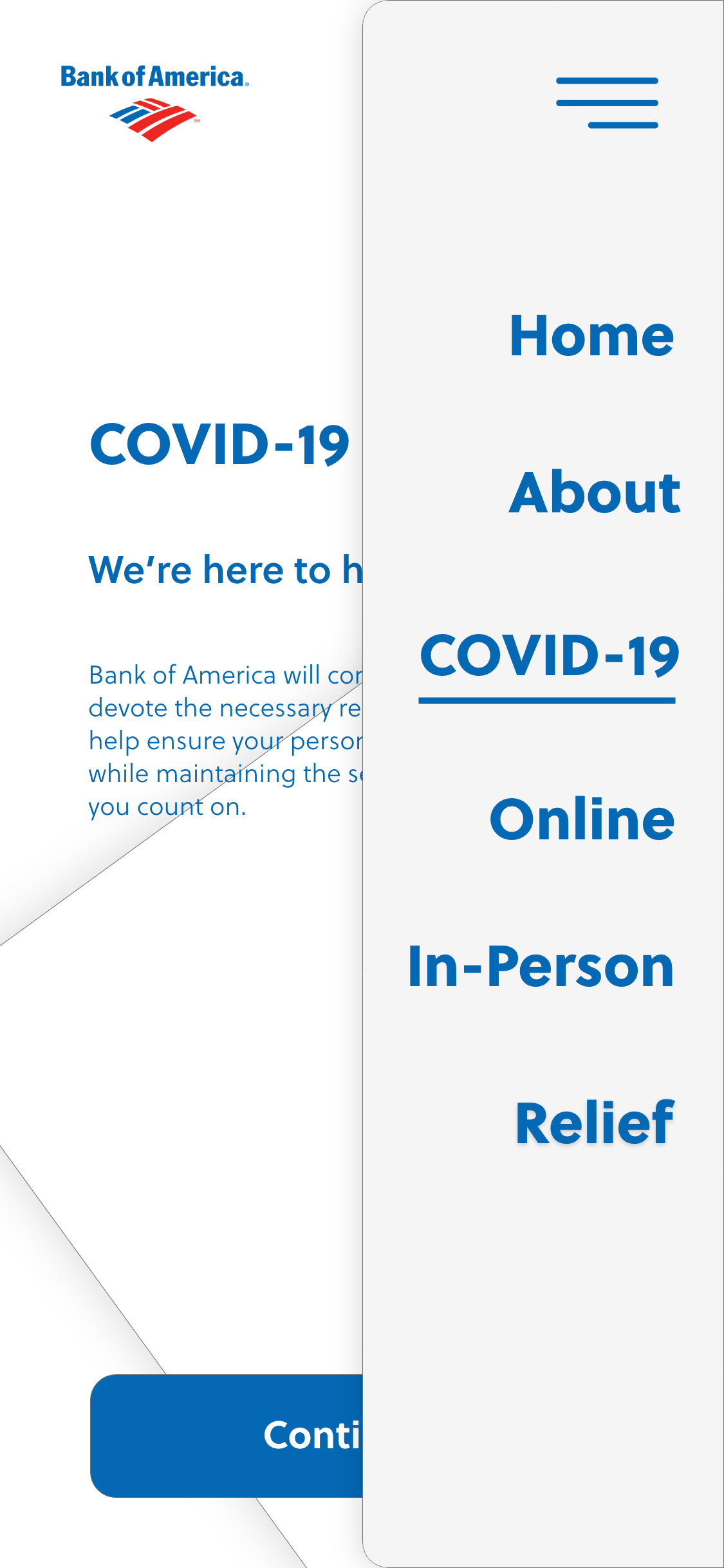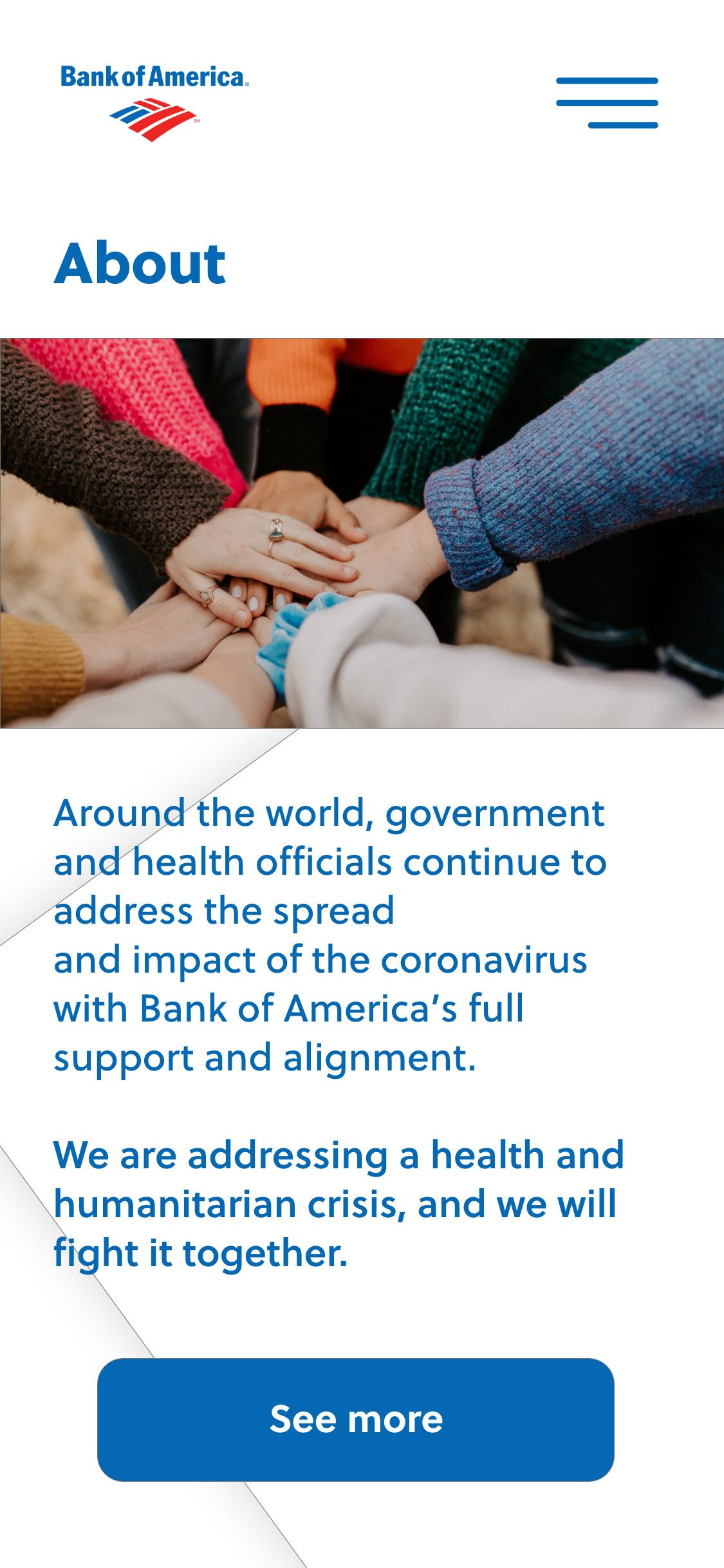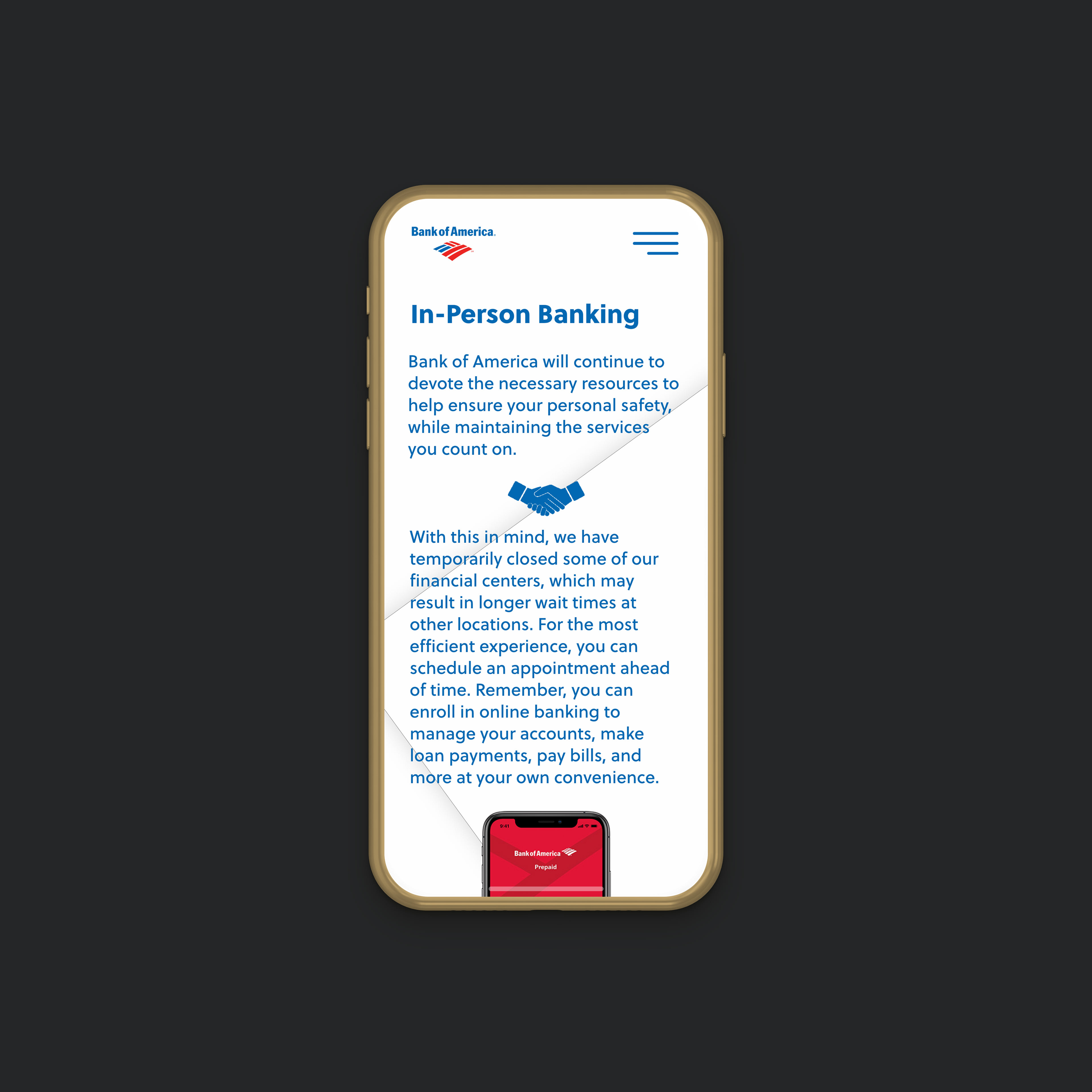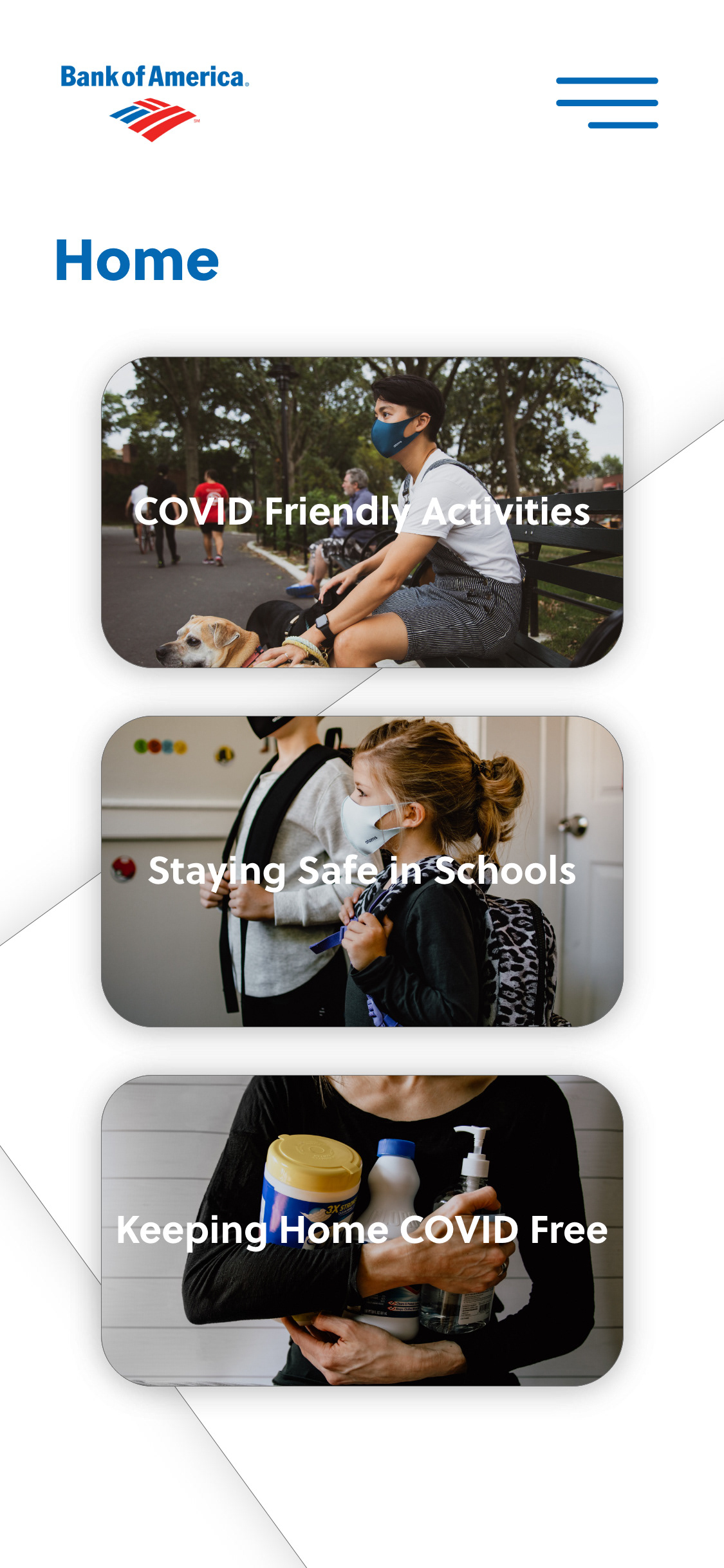 Task: Identify four of Bank of America's COVID-19 efforts and using copy/text from this company, develop an app to inform users about what your company is doing to keep them safe during this time.