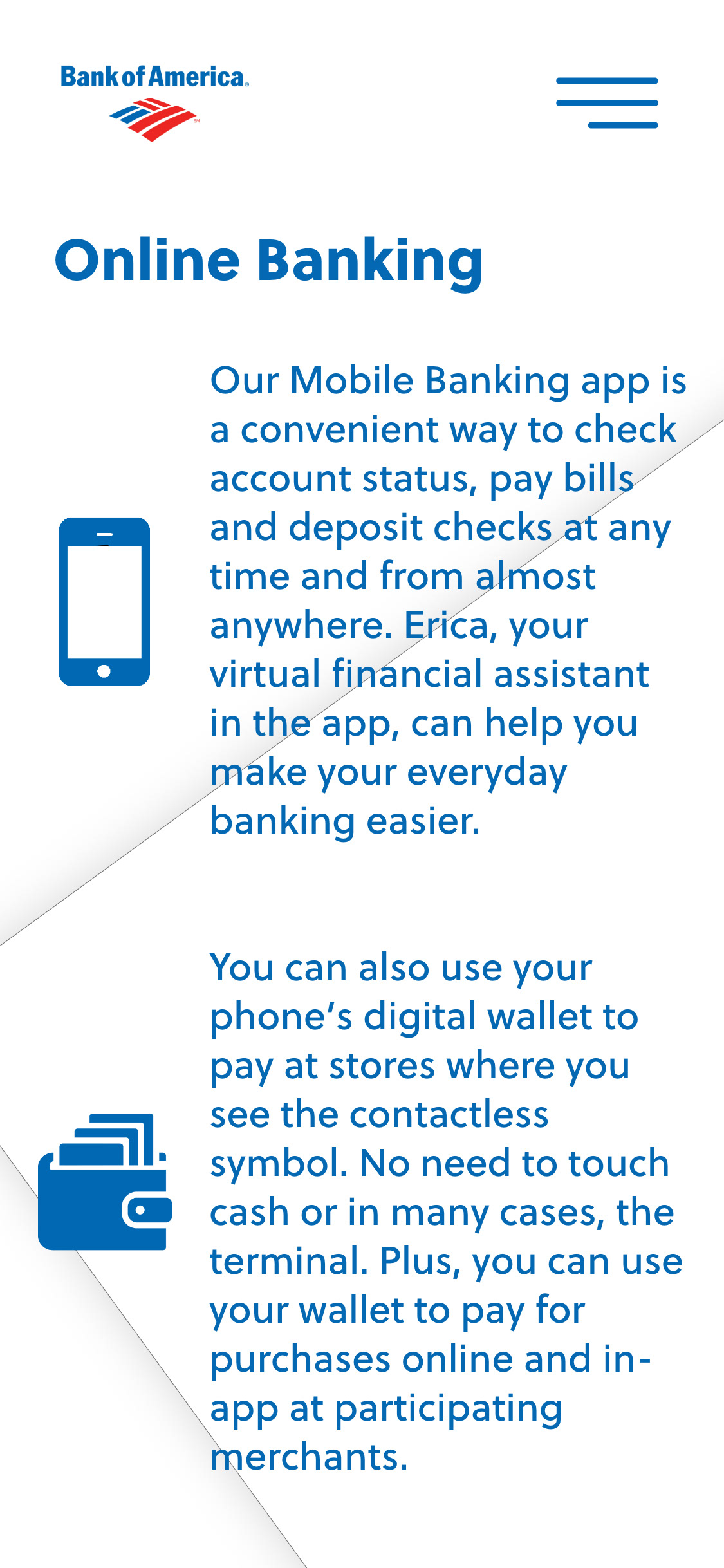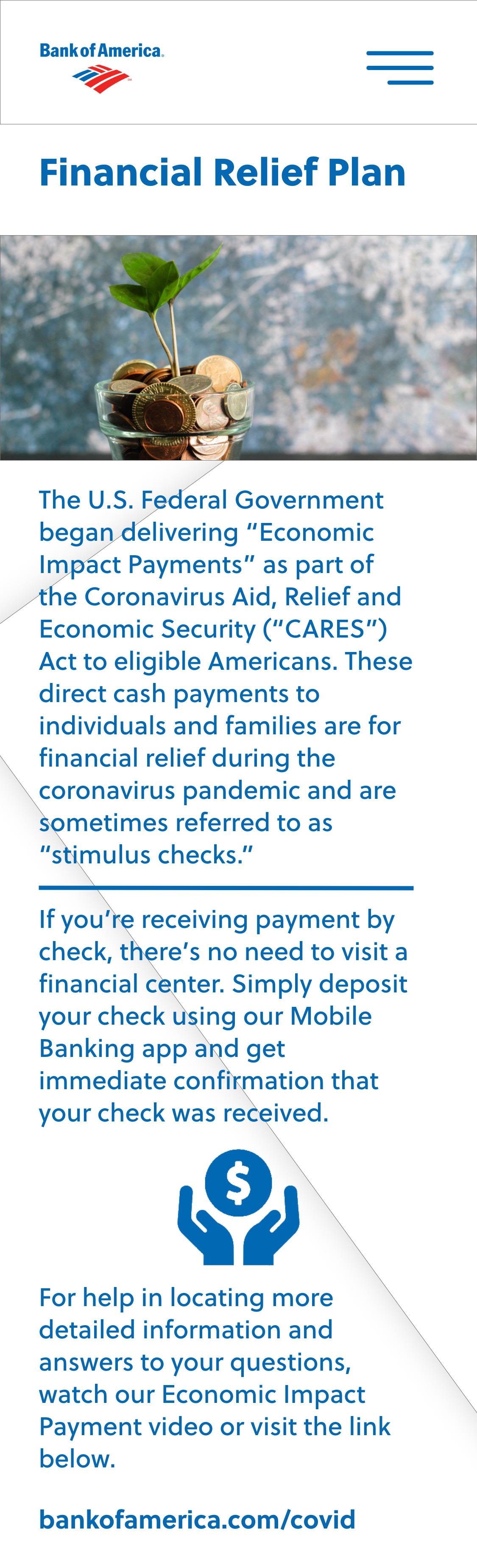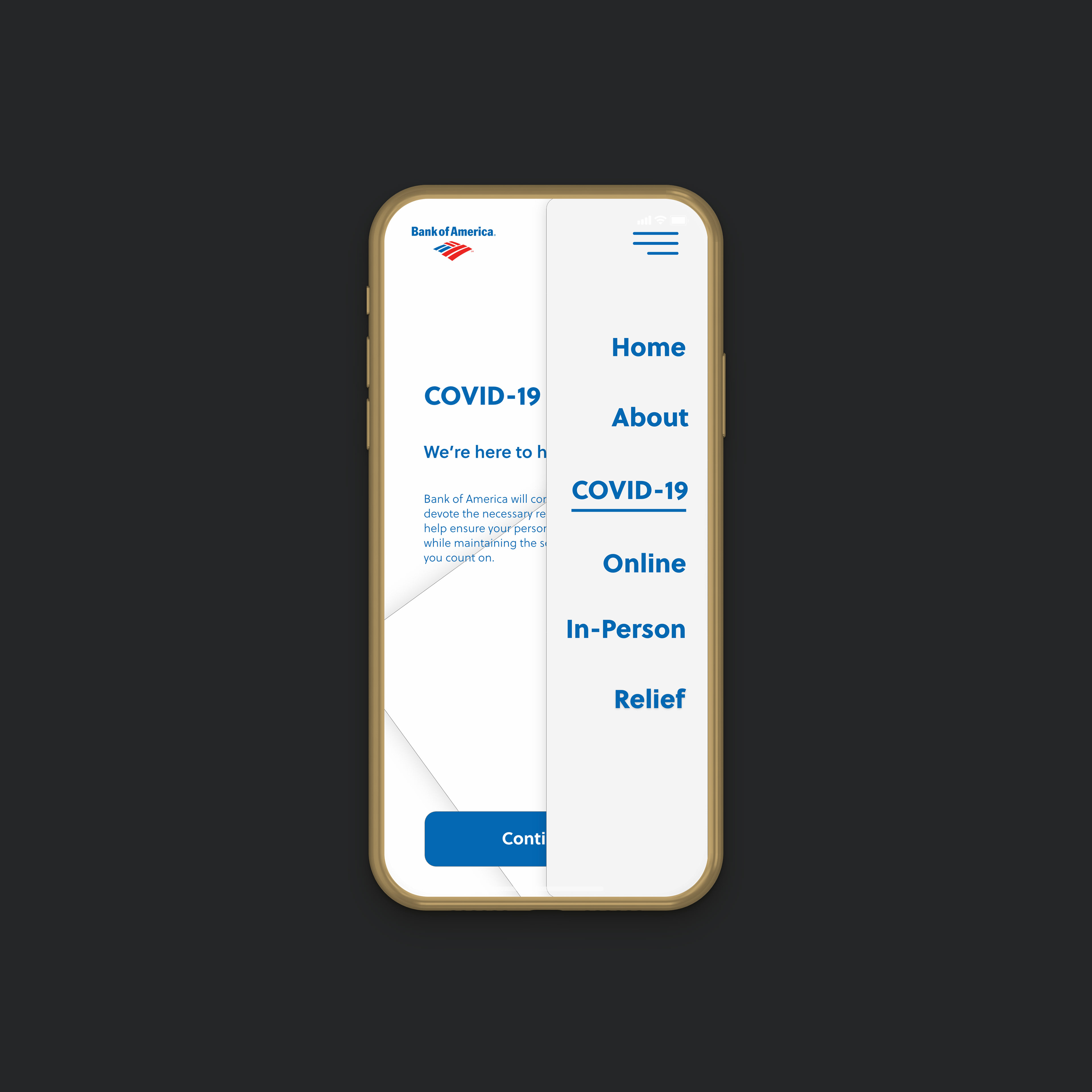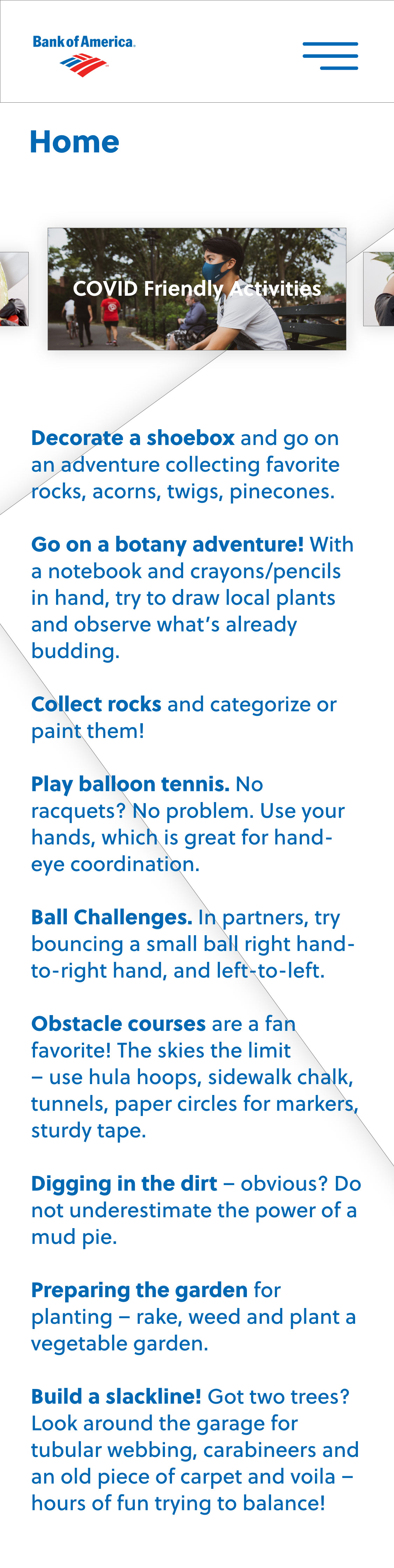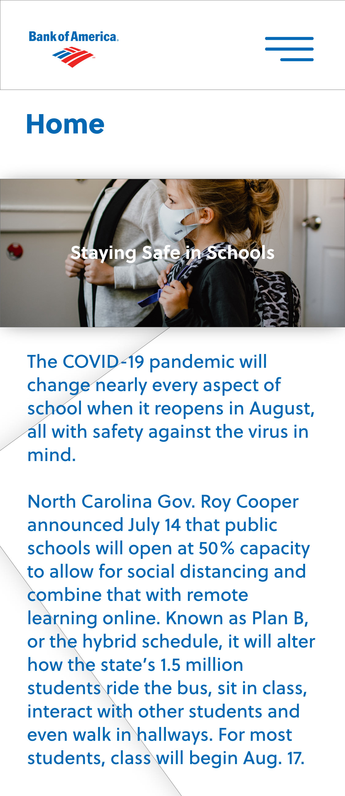 Task: Identify four of Bank of America's COVID-19 efforts and using copy/text from this company, develop an app to inform users about what your company is doing to keep them safe during this time.
